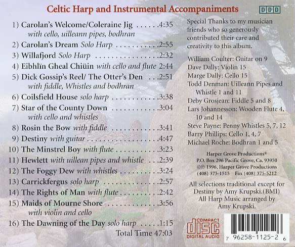 "Amy Krupski is one of my favorite recording artists on the harp. Her music is artfully arranged, allowing the harp to sing with the sweet gentleness her delicate touch brings, lifting the listener to another state of consciousness, a dream world so vivid you would swear it is real. Her arrangements have a way of bringing out the best of both the Celtic and classical worlds of the harp, skillfully blending the two worlds into one unique sound." |