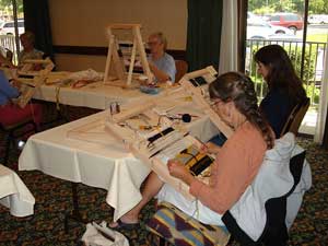 Marilyn wrote: We had a great workshop. We had a couple from the Klamath area and a few from the Bay Area.The seven women were very enthusiastic about the craft and some have expressed an interest in learning more. It was an intense three days. Mel and I made all the looms for the students; a table-top model as you can see from the pictures. The students had the option of purchasing the loom for a nominal fee and they all took them home. I hope that means that they will try to weave another piece and/or join us for further instruction. One of our students, an art therapist at the Coalinga State Mental Hospital, is trying to organize a fiber arts program there for the inmates. We met the most interesting people!