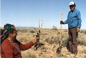 ![]() Sarah (Begay) Natani, Leona, and grandmother Mrs. Henderson holds Leona's just-finished rug with vegetal dyed yarn which became a present for Jim & Marilyn's 33rd wedding anniversary. |