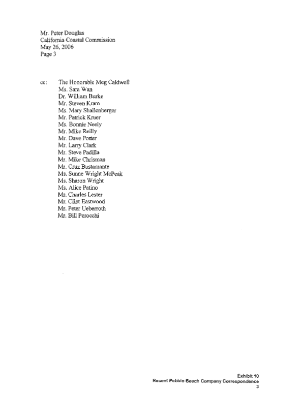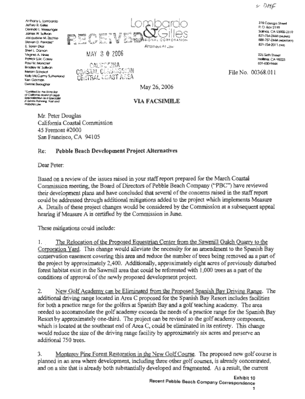 P. B. Co.'s attorney, Tony Lombardo, presents development project "alternatives" in a 3 page letter dated May 26, 2006 sent to the Coastal Commission as part of Exhibit 10 of the Staff's' June 2nd Report/Recommendation to deny approval of Measure "A" (below).