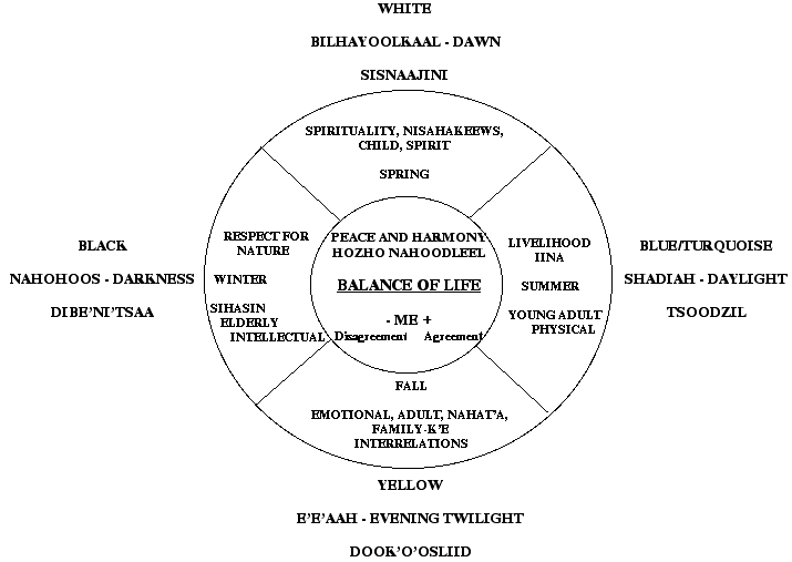 K'é is to restore Peace and Harmony within one's self, as husband and wife, a family unit, within an immediate clan, as a neighbor, friend or within a community. See a Peace and Harmony chart (below.) K'é is the foundation of Peace and Harmony, and should be used and practiced in our daily lives and activities. K'é as taught to those that were raised traditionally has many meanings. K'é if applied daily in our activities, could ease our minds, reinforce our respect and communication with those that cross our paths with Native Americans or Non-Native Americans. Because our elders taught and used K'é as a way of life, they were able to communicate, and accomplish whatever endeavors that challenged them. Through communication with one another, they formed a group "UNITY" and a nation of Native Americans and called themselves "Dineh" (The People). Although there were no financial or revenue available, they were able to survive and get along with one another, because their minds were at Peace within them and with those fellow beings and the Universe around them. From Peace of mind come many other Dineh Traditional values, i.e. Identity, Religion, Language, culture, Arts, Ceremonial rites, etc. Our traditional oral history is traditional education for our children. The important values are taught through our Dineh Language, it has meaning and has been respected by all who heard the teachings. Today it is becoming all apparent that some of these teachings are not being taught or handed down to many of our people especially our youth. Our values are being eroded and our UNITY may be at stake. We may be losing the values that United us. Our future can be just as prosperous as was in our past, we should teach one another our original values through K'é ! Leo Natani |