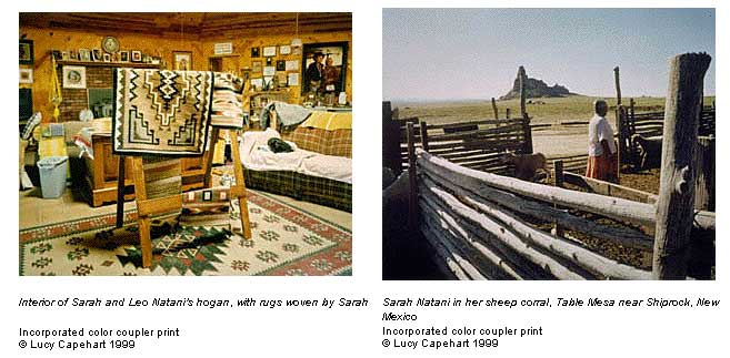 Photographer Lucy Capehart, a museum educator and curator, is known for her wide-open color landscapes, domestic interiors, and for being responsive to the people and subjects she is photographing. Her images show us the importance of sheep to Navajo life and traditions through photographs of Churro, fresh mutton for sale, and beautifully woven traditional rugs. DBI leader Sarah Natani is seen in her sheep corral and her rugs are shown in her hogan. |