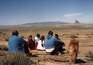 ![]() Looking eastward from top of Table Mesa toward the Four Corners (where four states meet.) Note lenticular cloud above Shiprock in the distance. |