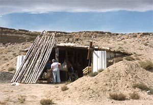 ![]() Carol Lane looking into the root cellar with dried sheepksins where Bruce slept inside a small tent during the week while others slept in the hogan or their camper shell.