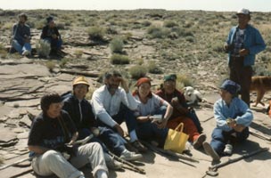 ![]() Resting at top of Table Mesa. Father David, Dorothy Miller (at back), Mary Black, Marilyn Brandon, Bruce Belknap, Odelia Rodrigurez, Sarah, Carol Lane, Leo (standing) Photos by Jim Brandon. |